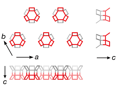 There are two different PerBU's (layers), but both connect to the next layer in the same way. The 6-rings in the adjacent layers connect to form a hexagonal pattern of d6r units. The attached 4-rings on either side of the d6r units are related either by a local inversion center (i) or a local mirror plane (m). The layers are stacked along the [001] direction using the following connectivity patterns